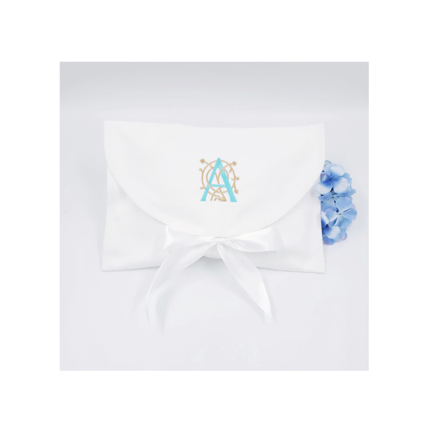 Our Cotton Pique envelope style bags are trimmed with satin ribbon closure. Fully lined. These are just perfect for lingerie, shoes, gifts, and your most precious keepsakes. Add a name, monogram or clever saying. Some favorites have been "delicates," "no peeking," "skivies." Ready to personalize.