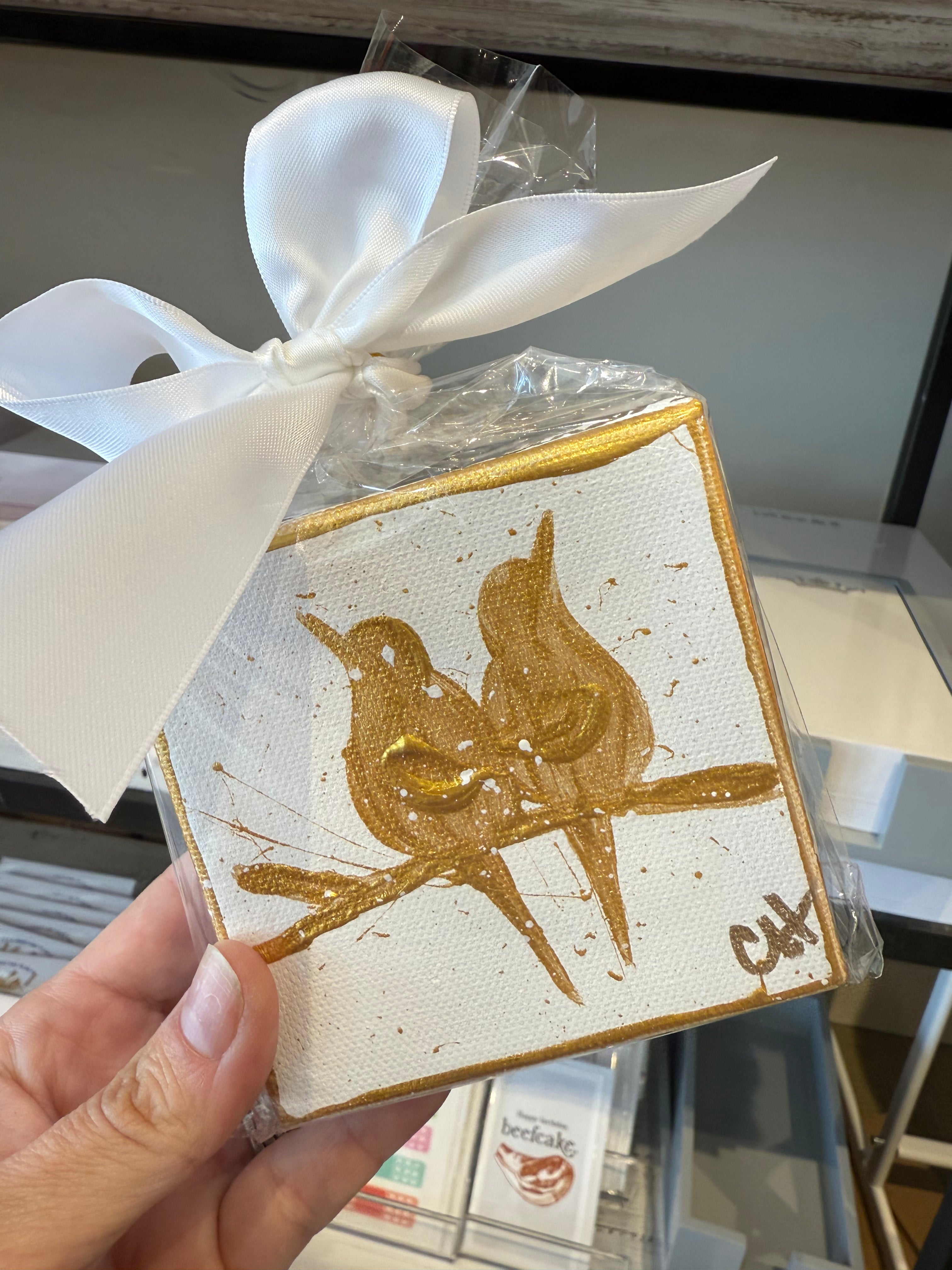 Precious canvas to sit on bedside, dresser or desk. Pair of Gold Birds on white canvas.