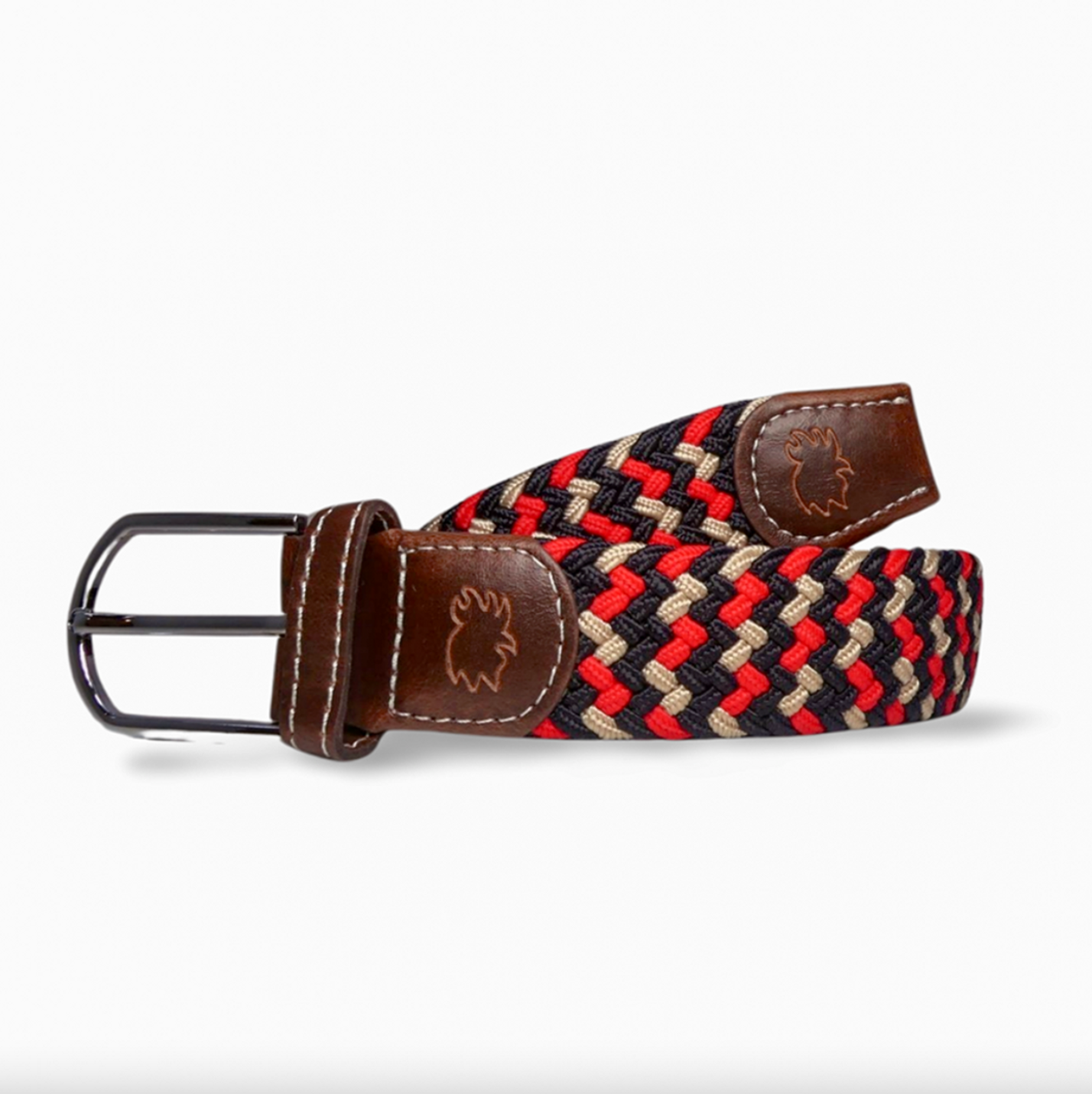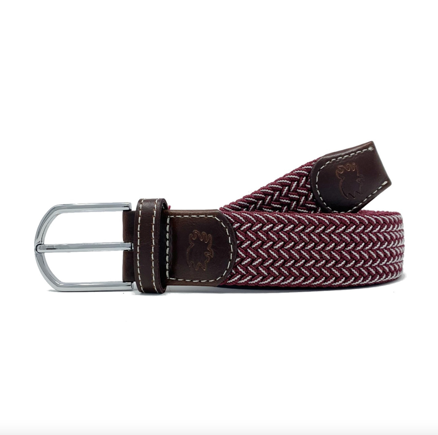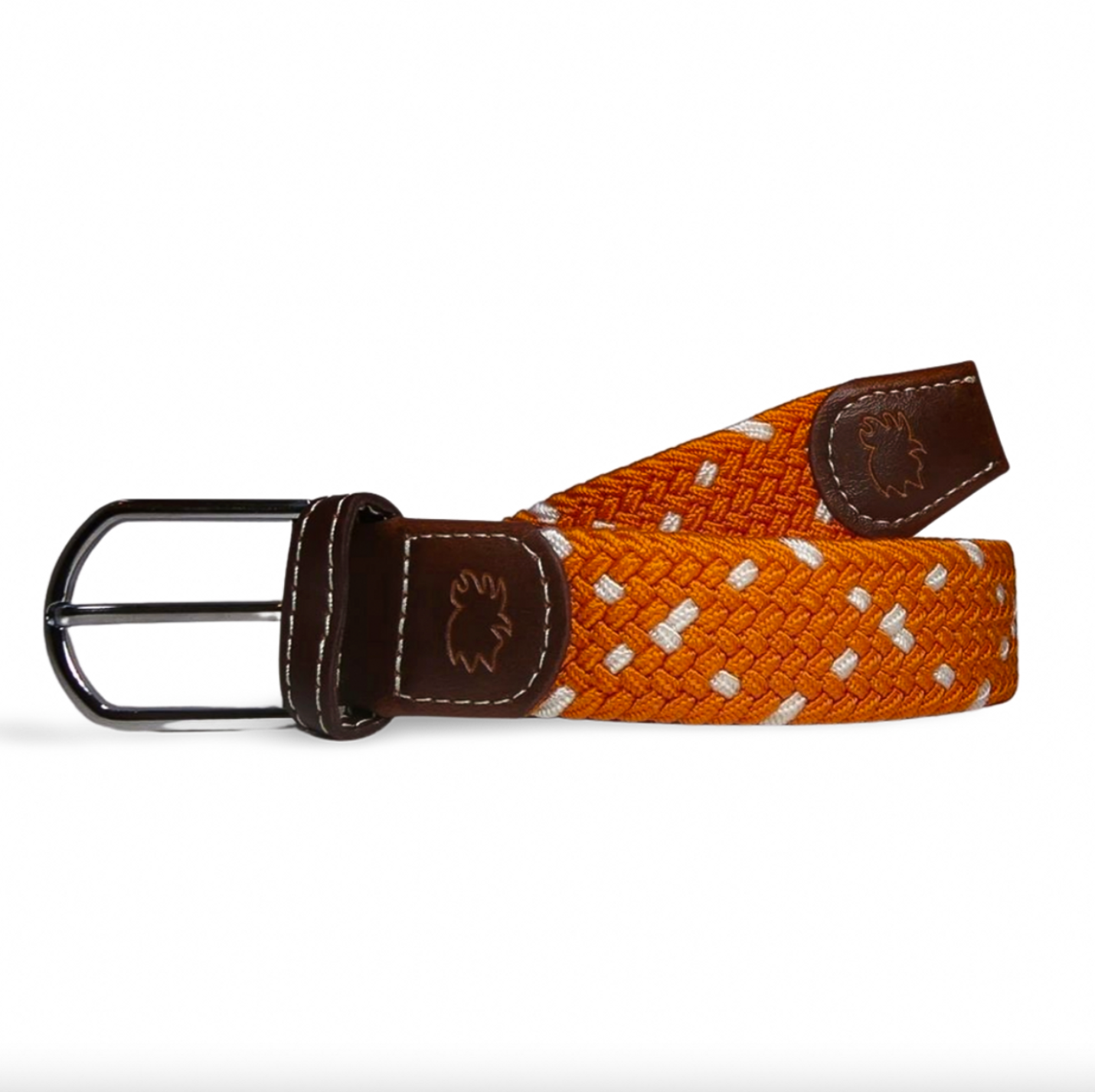 Kid’s Woven elastic stretch belt. Rounded buckle with dark brown leather stamped with the Roostas logo. An adjustable clasp goes through the woven elastic, to allow for adjustable sizing. Designed for comfort on and off the course.