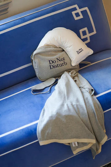 Inside, discover the Jetsetter Mini® travel pillow, satin-lined eyemask and heather grey oversized cotton throw, elegantly trimmed in ivory.