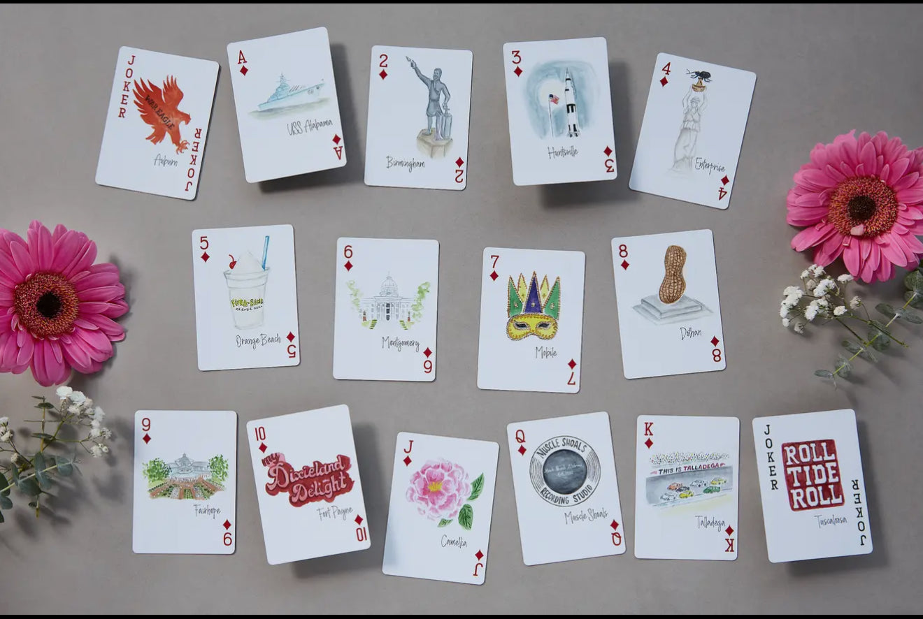 State of Alabama themed playing cards featuring 19 different unique watercolor images representing different cities and themes that make Alabama unique. Including, USS Alabama, Birmingham, Huntsville, Enterprise, Orange Beach, Montgomery, Mobile, Dothan, Fairhope, Fort Payne, the Yellowhammer, Cotton, Monarch and Camellia, Muscle Shoals, Talladega, Tuscaloosa and Auburn.