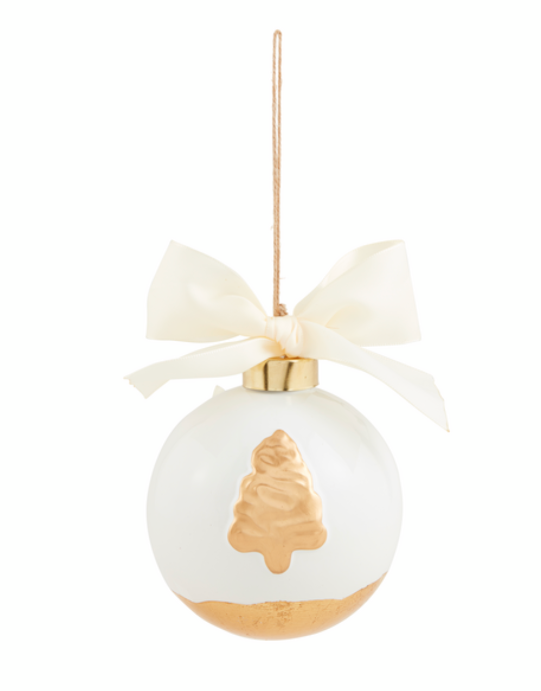 The Gold Painted Ball Ornament is a stunning addition to your holiday decor. This exquisite ornament is meticulously hand-painted with gold foil on a ceramic ball, creating a luxurious and elegant look. It features a delicate satin bow that adds a touch of sophistication. The ornament is crafted from dolomite, ensuring its durability and longevity. Measuring 4" in diameter, it is the perfect size to hang on your Christmas tree or display on a mantel or tabletop. The ornament comes with a twine hanger, making it easy to hang and showcase its beauty.