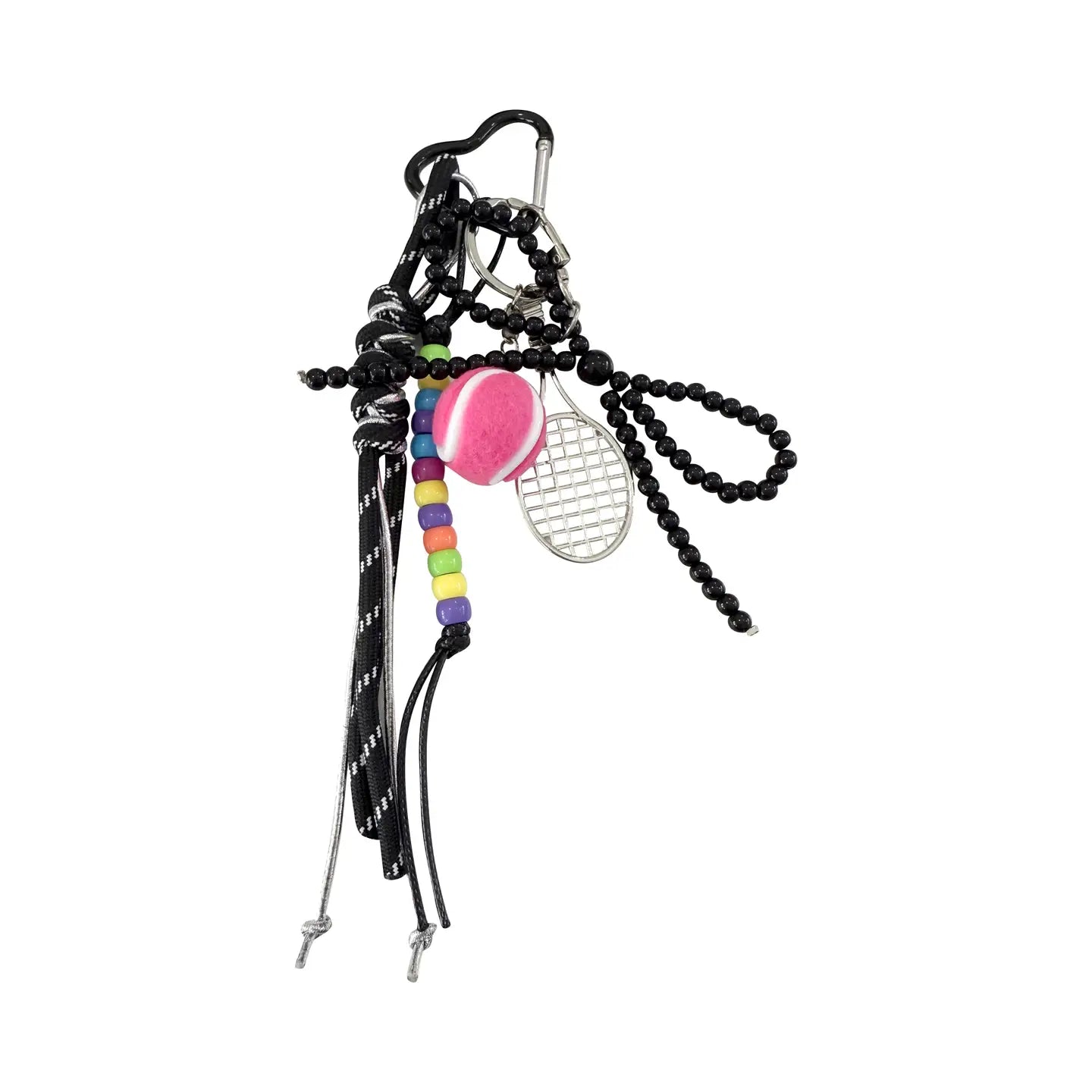 Sporty meets chic with the Becca Bag Charm in Black with Tennis Charm. Featuring a hot pink tennis ball charm, tennis racket charm, black beaded bow, and multicolored charms, this stylish accessory is perfect for tennis lovers. Designed for multi-use, it can also be attached as a bag charm for added versatility.