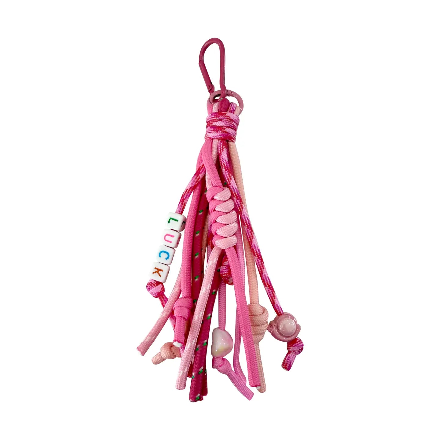 Playful and stylish, the Sporty Bag Charm in Pink Luck adds a bold pop of color to any accessory. Featuring a hot pink key ring with LUCK beads, a heart charm, and a mix of pink tassels, this eye-catching charm instantly enhances handbags, purses, backpacks, school bags, or suitcases. Designed for versatility, it brings a fun and personalized touch to any look. Equipped with a sturdy metal key ring and a secure clip, this charming accessory easily attaches to bags, keys, or even car interiors, making it a perfect everyday statement piece.