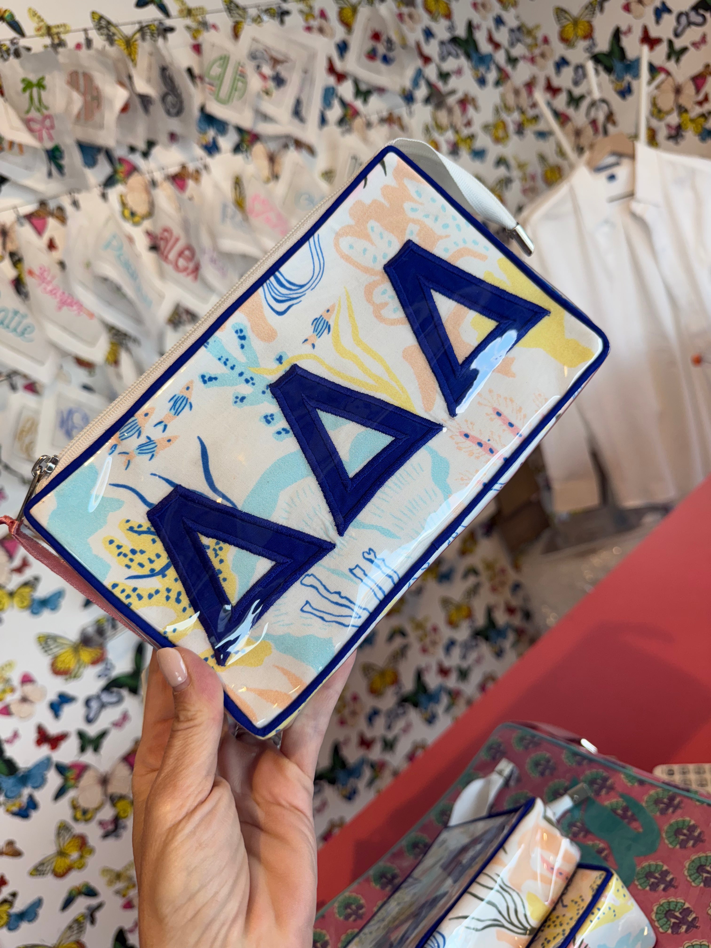 How perfect is this Sea Life Applique Cosmetic bag for your Tri Delt! Plastic Coated so you can always wipe off. Easy size for your purse or carry on, but you'll want to have it out to show her off!